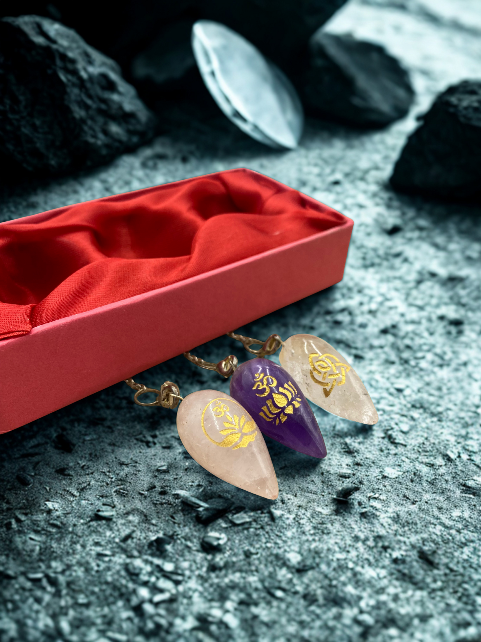Coffret 3 pendules : Cristal de Roche, Quartz Rose et Améthsyte